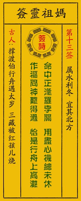 【台湾北海观音明善堂】命中正遇到“罗孛”凶星,虽然用尽心机也避免不了,就是问神祈福,还是躲不过去,正像行船遇到沙滩,进退不得。此签暗示需要更多的行善布施功德来增加福份。才能减轻灾难。求得此签暗示目前福报不好,正处于进退维谷的时候。问事求谋不可。问出外移居,不吉。老年人求得此签暗示,表示一生白费心机,老来已无甚希望。若年轻人求得此签暗示,不必难过,这正是考验你的时刻,只要能克服困难,自有光明前途。问功名,要充实你自己,目前希望不大。问婚姻,缘份未到恐难成功,不宜勉强。问疾病,犯太岁者谨防意外,病慎医治,少年人尚无碍,若老年人,则有阴邪元辰暗淡,宜求神消灾解厄。 【台湾育德妈祖同修会】命中正遇到“罗孛”凶星的关头,虽然你用尽心机也避免不了,就是问神祈福,还是躲不过去,正像行船遇到沙滩,进退不得。抽到此签,表示你目前正在进退维谷的时候。问出外移居,不吉。老年人抽到此签,表示一生空费心机,老来已无甚希望。若年青人抽到此签,不必难过,正是考验你的时候。只要你能克服困难,自有一光明前程。问功名,还是要充实自己,目前希望不大,问婚姻,缘份未到恐难成,不宜勉强。问疾病,须谨慎医治,少年人尚无碍,若老年人,则恐有问题。 |