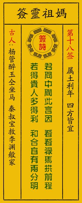 【台湾北海观音明善堂】求得此签暗示累积的福报,问事求谋将有收获。你的心地良善,上天因你平日一心向上,若能再多拜神修福,热心公益。累积善因善心,自有更多的福报,做事求财,自然会有神明及贵人帮助你成功圆满顺遂。问功名,这是大吉之兆,可以积极去发辉,表现你的才能,你未来前程光明远大,自不在话下。问婚姻,只要两情相悦,婚谈必可有情人终成眷属。如果年届中年仍未婚,必定能在近期获得佳音。移居,出外,行船,凡事求和,均吉。此签惟问疾病不吉,男无妨女危险求神渐渐痊愈。 【台湾育德妈祖同修会】如果你要问这中间的因果,请看看“禄马贵人”帮助你前程的发展,就可领悟。如果你能得到“贵人”的帮助,自然一切顺利,一切都能圆满和合。抽到此签,表示你这个人心田好,善心自有善报,做事求财,自然会有“贵人”帮助你,使你成功。问功名,这是大吉之兆,可以积极去发挥,表现你的才能,你未来前程光明远大,自不在话下。问婚姻,是佳偶天成的好预兆,婚谈可成,是有情人终成眷属,可喜可贺!移居、出外、职位变动,均吉。此签惟问疾病,不吉,须有“贵人”出现,才有痊愈的希望。 |