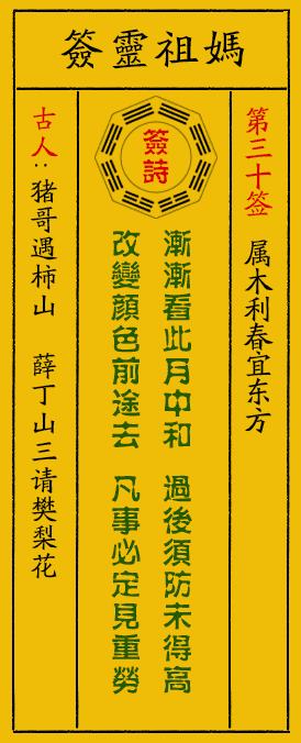 | 解曰 | 讨海:了工无利。 作塭:枉费徒劳失利。 鱼苗:无望。 求财:无利益。 耕作:了工后半年好。 经商:经营不就。 月令:不遂。 六甲:空孕勿躁。 婚姻:不成。 家运:家庭了钱难安。 失物:月光未日在。 寻人:行人渐回。 远信:音信有变。 六畜:不佳。 筑室:居之不安。 移居:不可。 坟墓:地气不佳。 出外:遇难待不可出。 行舟:无利。 凡事:了钱甚不好。 治病:险月半不愈重。 作事:难成。 功名:不成难近。 官事:枉费了钱。 家事:门有险了钱灾。 求儿:不可且慢。 |