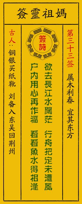 | 诗曰 | 欲去长江水阔茫、行舟把定未遭风、户内用心再作福、看看鱼水得相逢。 |