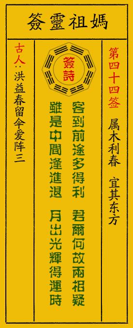 | 解曰 | 讨海:可能得利。 作塭:有获大利。 鱼苗:有利可得。 求财:渐利益亨可喜。 耕作:有利可得。 经商:大吉利市。 月令:待时可安。 六甲:弄瓦之庆。 婚姻:慢即可成。 家运:左右护持。 失物:月光在寅辰在。 寻人:月光在。 远信:速报好音。 六畜:可纳。 筑室:可居安乐。 移居:大吉。 坟墓:地气渐发财。 出外:一路春风。 行舟:大吉。 凡事:月光好。 治病:月光安运光彩。 作事:运至事成。 功名:必能得进。 官事:了钱月光完局。 家事:志气远大。 求儿:不可。 |