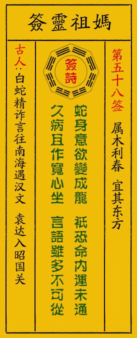 【台湾北海观音明善堂】蛇身要想变成龙,只恐命里运气还未通,那是不可能达到目的。还是宽心调养虚弱的身息,宽心地等待吧,虽然别人意见很多,但是不要随便相信听从。此签告诉当事人,运气停滞未通,做事多阻碍,万事不尽如意。但不要悲观自暴自弃而堕落,要忍耐奋斗等待有利时机来临。求得此签暗示目前福报欠佳,问事求谋,劳心劳力又徒劳无功。应求神行善善作福。问求财,小钱有,大钱不能获得。问功名,成绩欠理想,难达成愿望。问婚姻,障碍多,不易成功。问诉讼,恐拖延时间,而且胜败反覆不定。出外移居,一动不如一静,均不吉。问疾病,不愈拖尾,宜求神消灾解厄。 【台湾育德妈祖同修会】蛇身要想变成龙身,只恐命里运气未通,那是不可能达到的。病久虚弱的身体,还是宽心地等待,不要自不量力。虽然意见很多,还是不要去听从。此签告诉当事人,运气停滞未通,做事阻碍多,万事不如意。不要悲观自暴自弃而堕落,忍耐奋斗以等待有利机会的到来。问求财,小钱有,大钱还是不能获得。问功名,成绩欠理想,难达成愿望。问婚姻,障碍多,不易成功。如果强求,反而得不到美满姻缘。问诉讼,恐拖延时间,而且胜败反覆。出外移居,一动不如一静。均不吉。 |